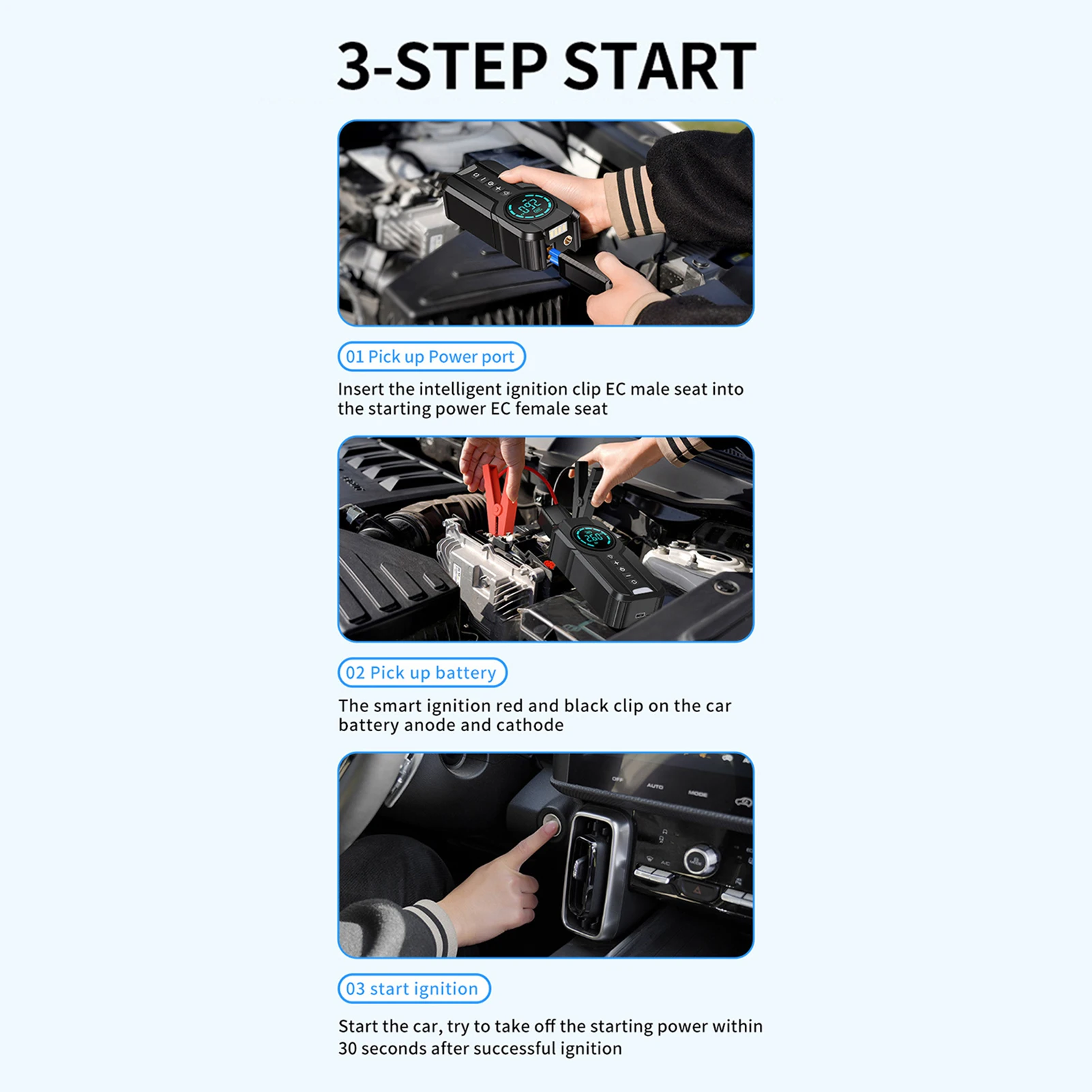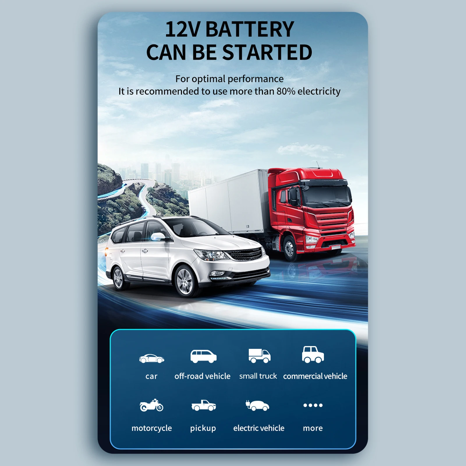 Wide Vehicle Compatibility: The jump starter and air compressor is suitable for a wide range of vehicles, including cars, off-road vehicles, small trucks, commercial vehicles, motorcycles, pickups, and electric vehicles.